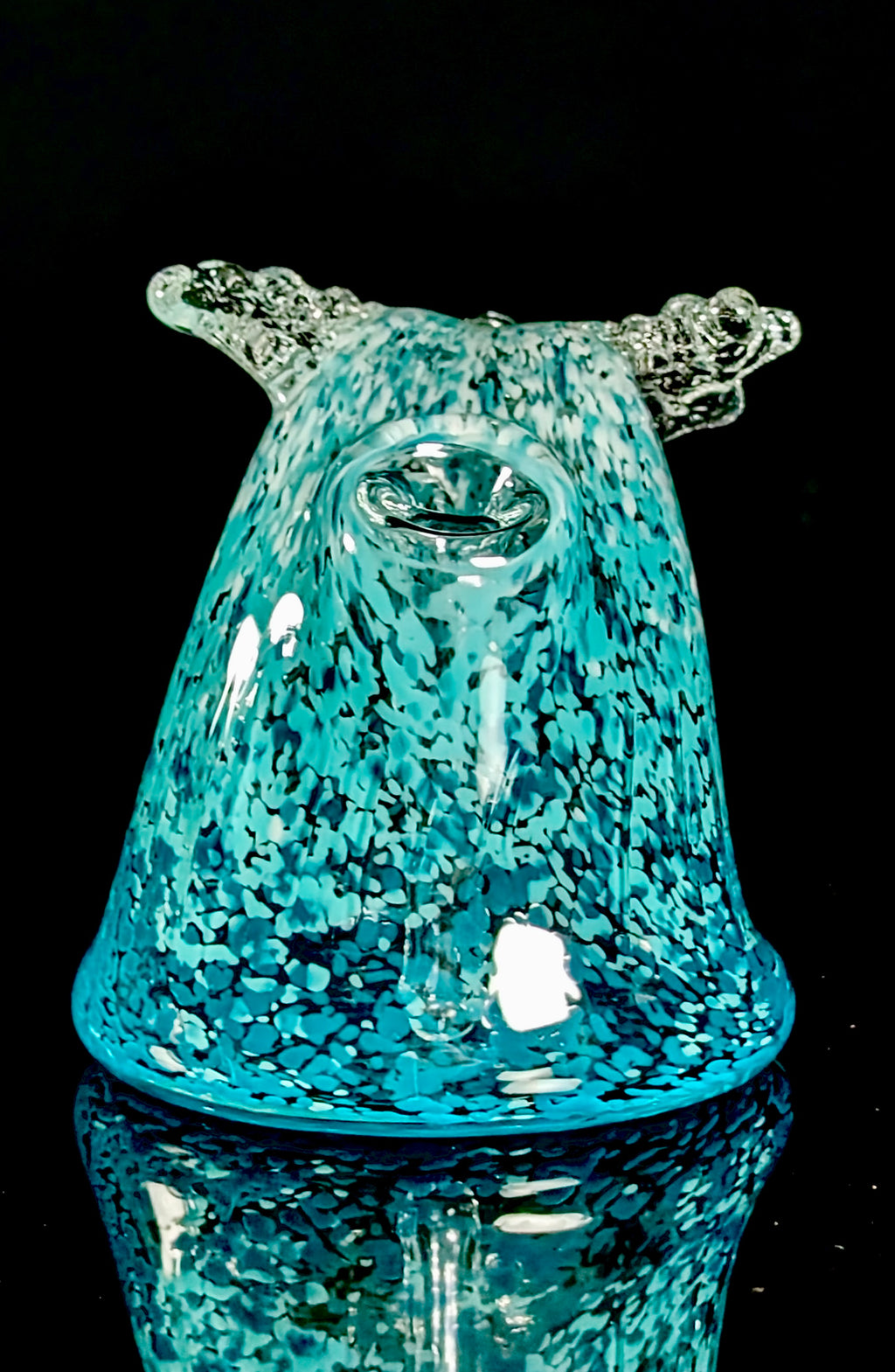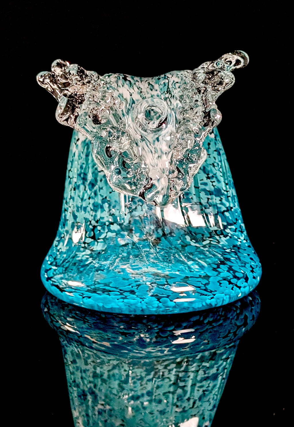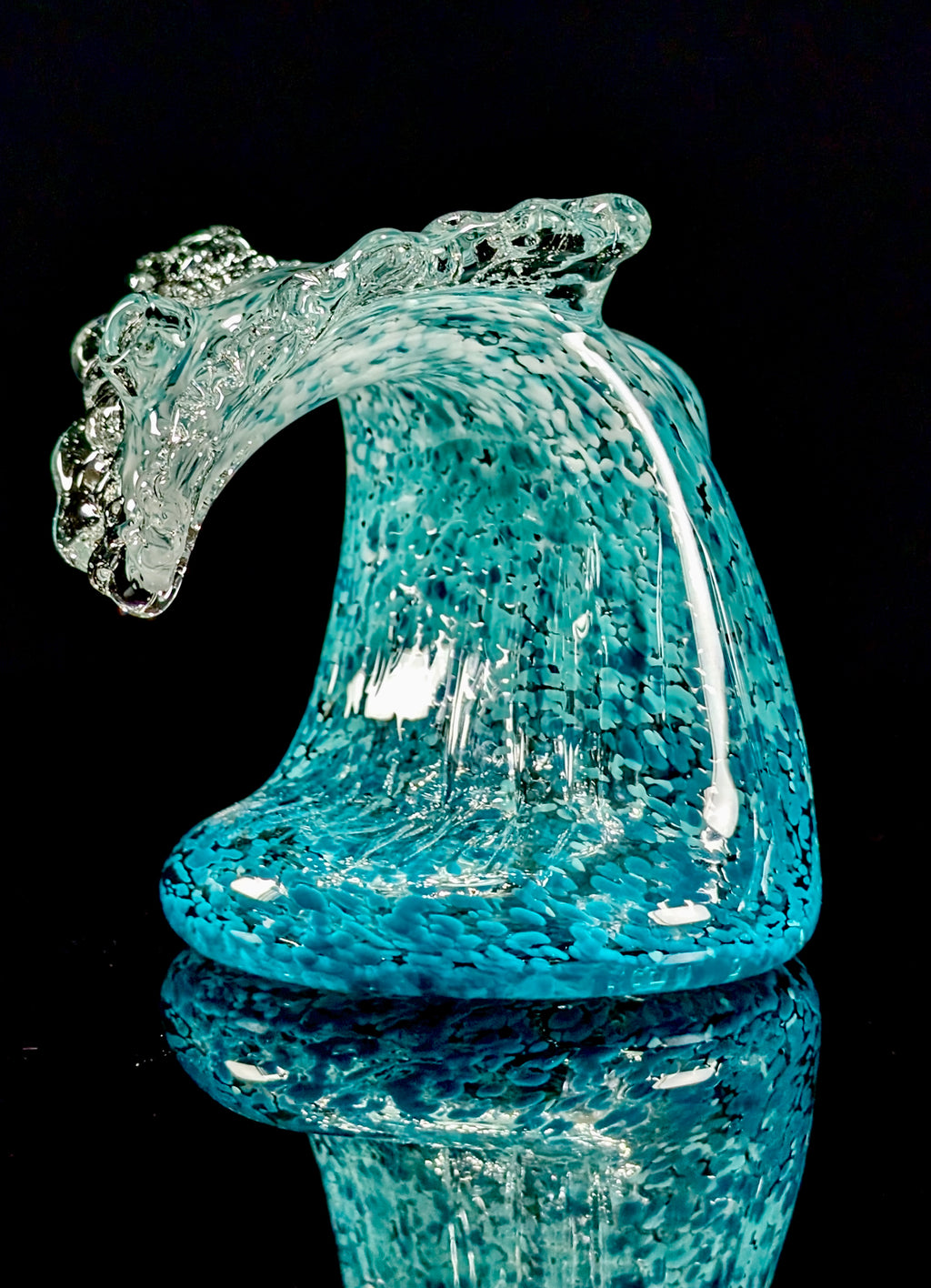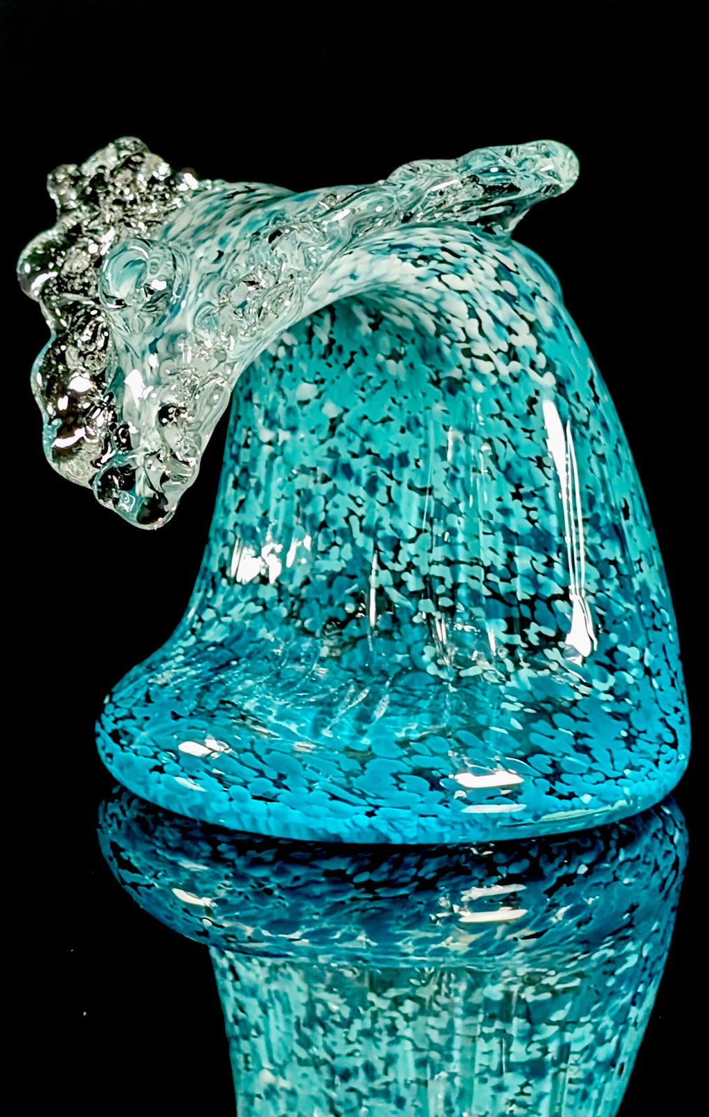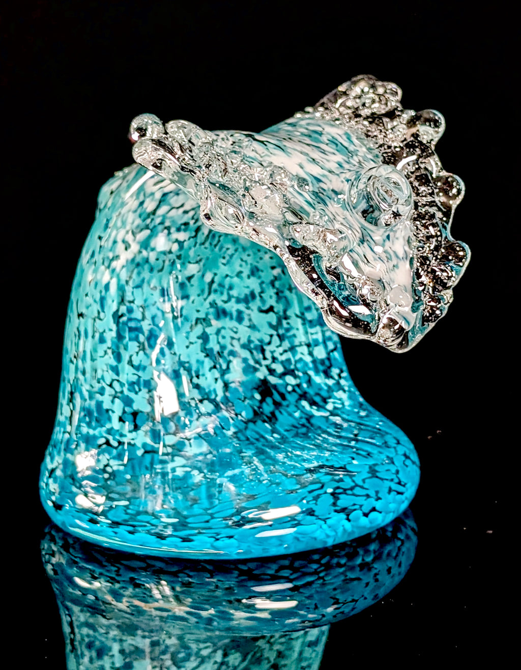 This is the medium colored wave, it’s a white to light & dark blue fade. Made using the inside out frit technique to mimic the large soft glass sculptures of waves. My unique design makes for a smooth rip with no water in your mouth.