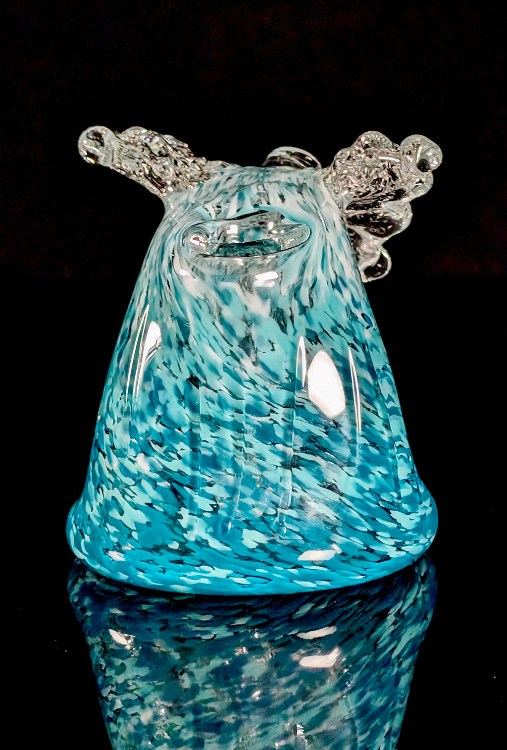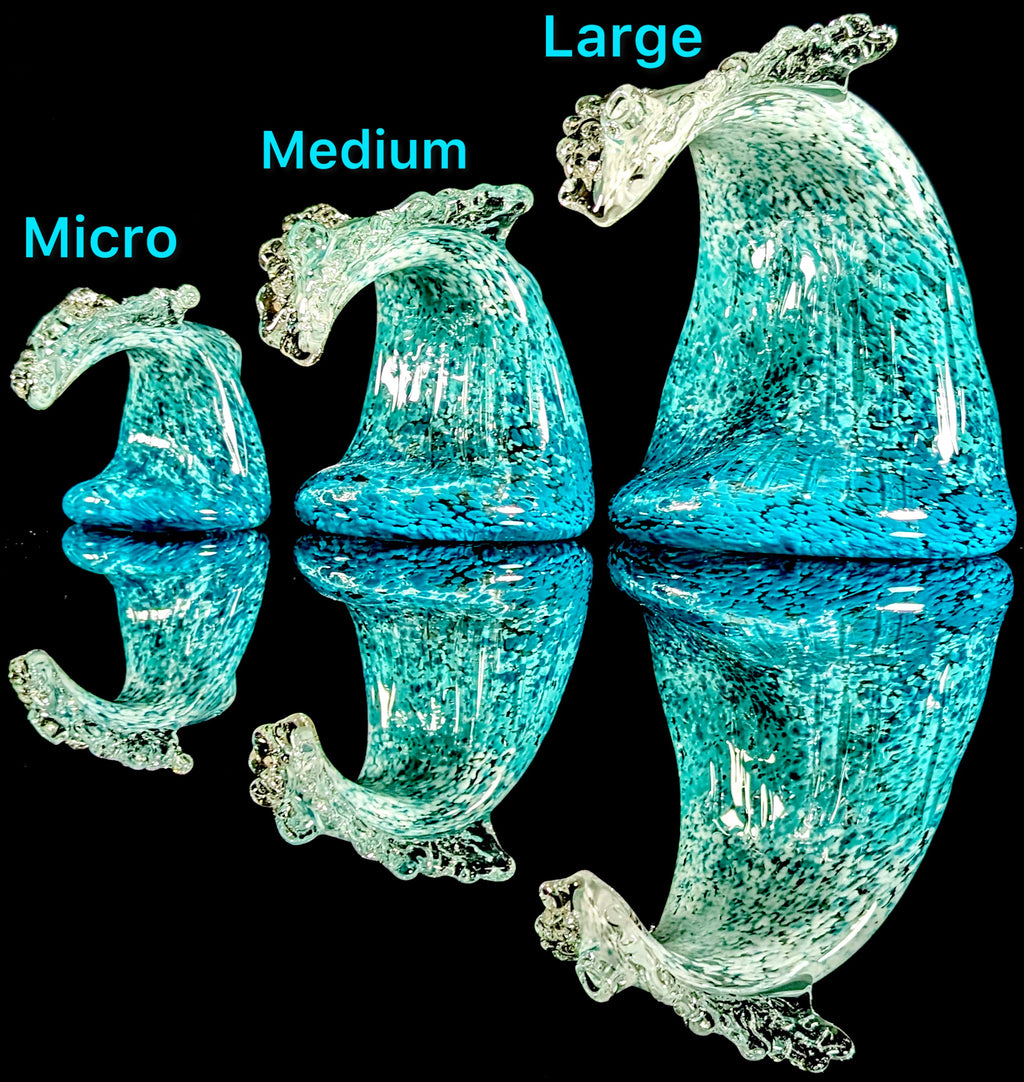 This is the Micro Wave colored wave, it’s a white to light & dark blue fade. Made using the inside out frit technique to mimic the large soft glass sculptures of waves. My unique design makes for a smooth rip with no water in your mouth.