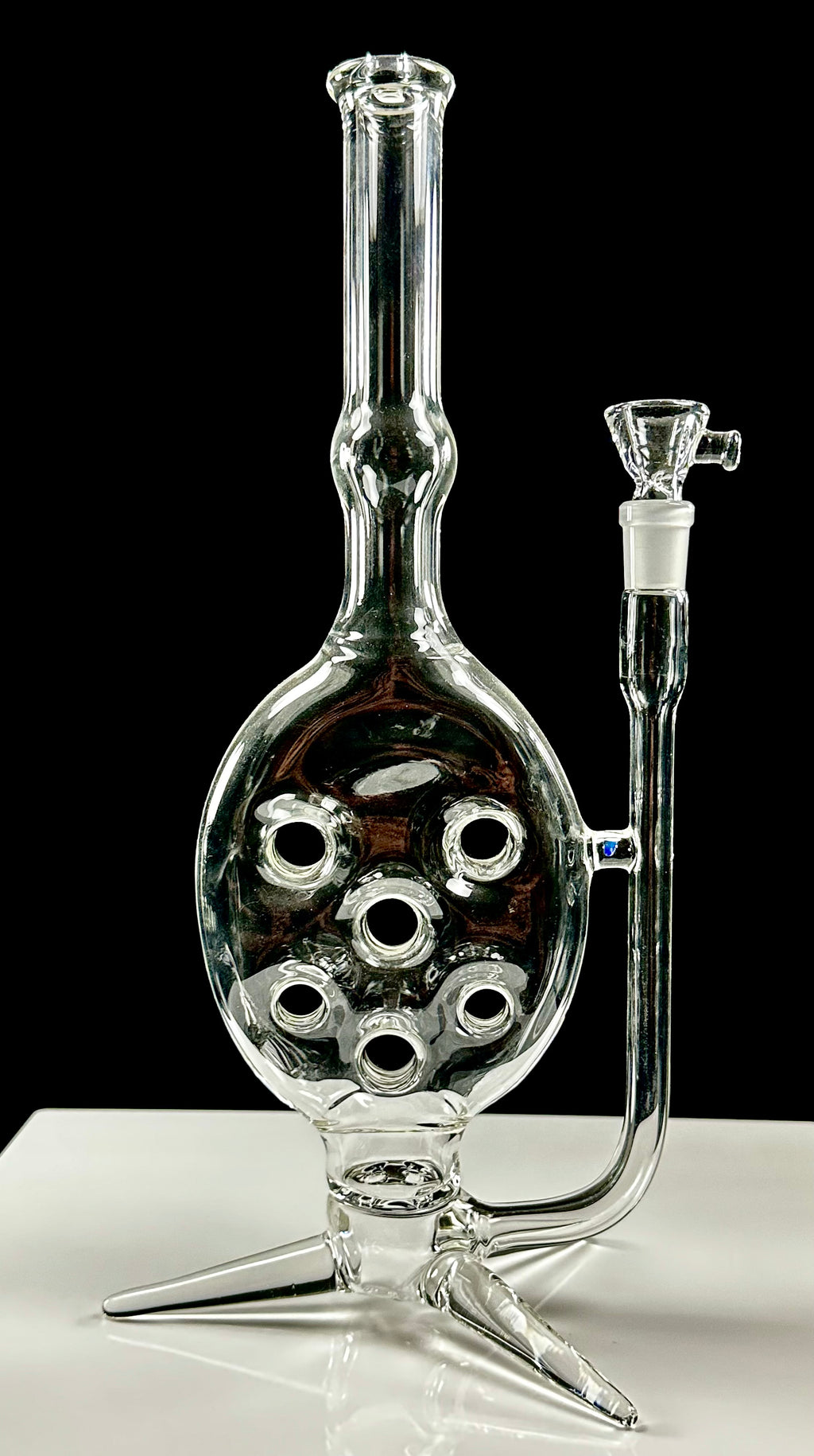 The Swiss Perc Bong from Dippy Glass!! Check out the six-hole Swiss Perc with a stemless diffusor. The three-leg base keeps this piece upright and stable. Comes with matching 14mm bowl.