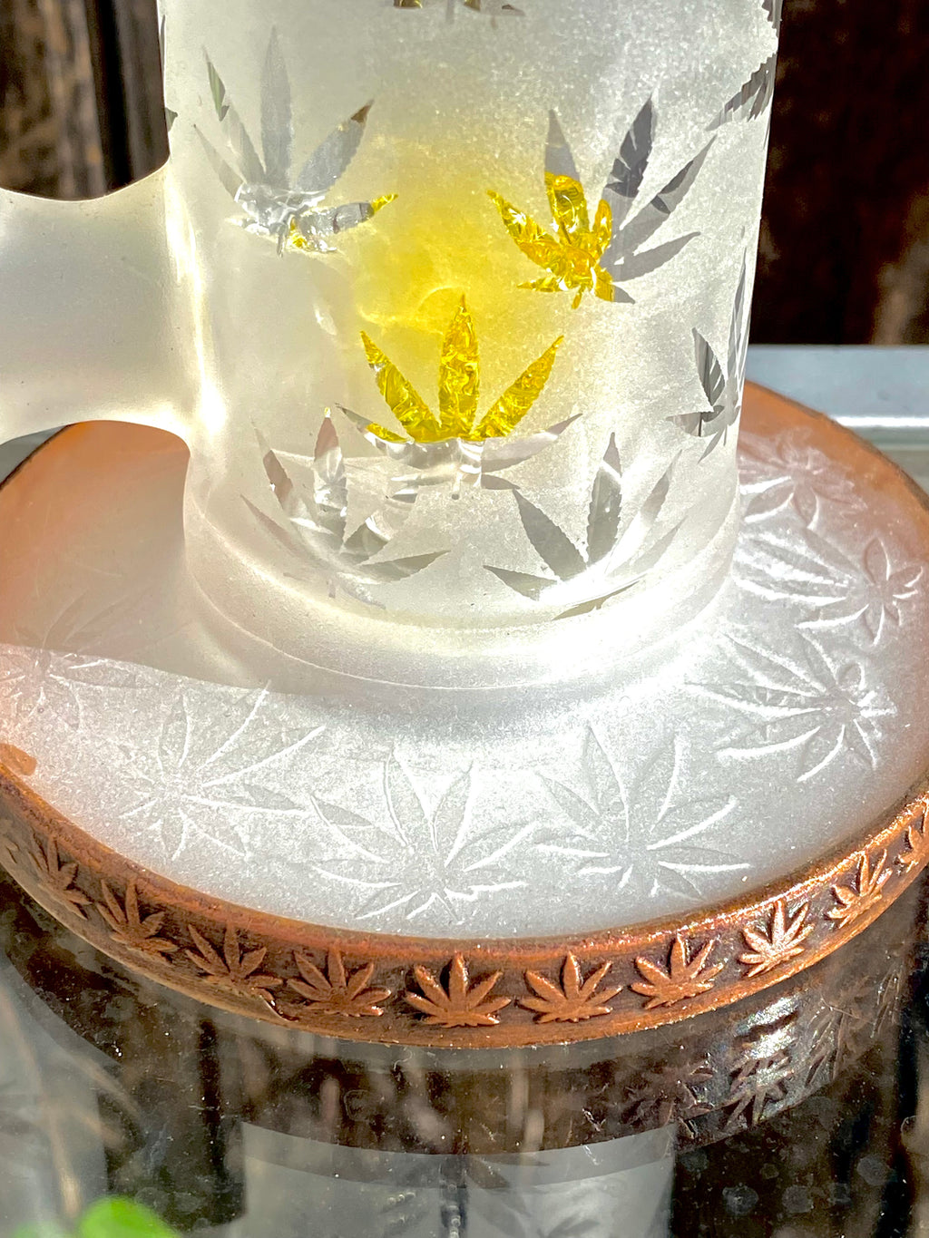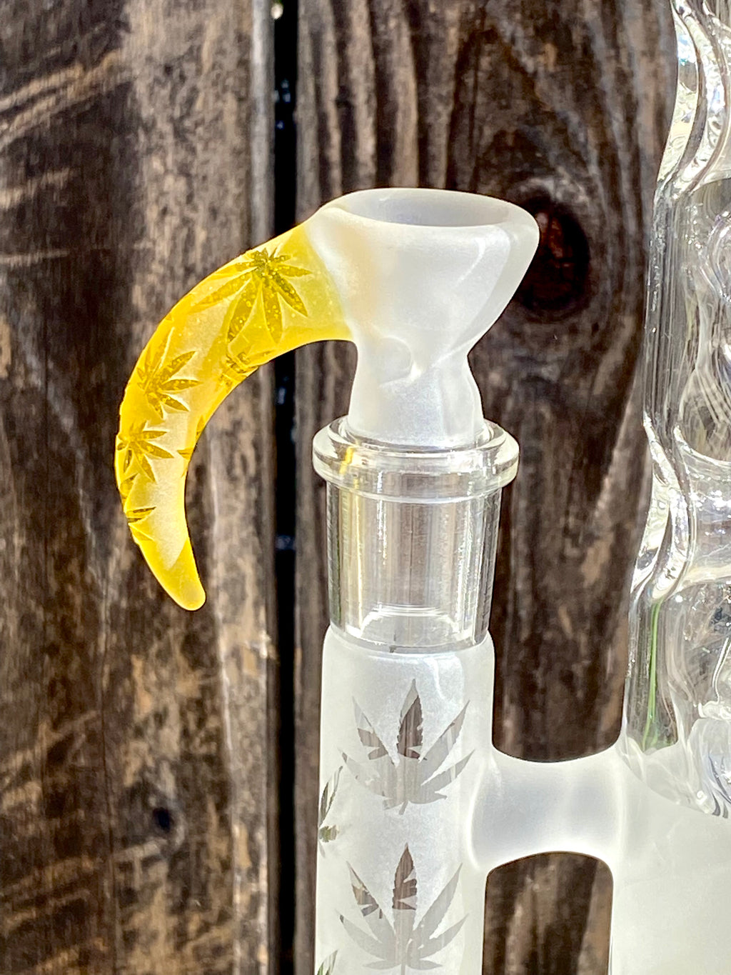 FLUID GLASS CUSTOM V3 TERPS CORAL TO 18 HOLE FAB TUBE 18 mm With CUSTOM EFORMED COPPER BASE & SANDBLASTED POT LEAVES by Lord Kramdar. Comes with matching 3 pinch SANDBLASTED 18mm slide. ***COLOR CHANGING***