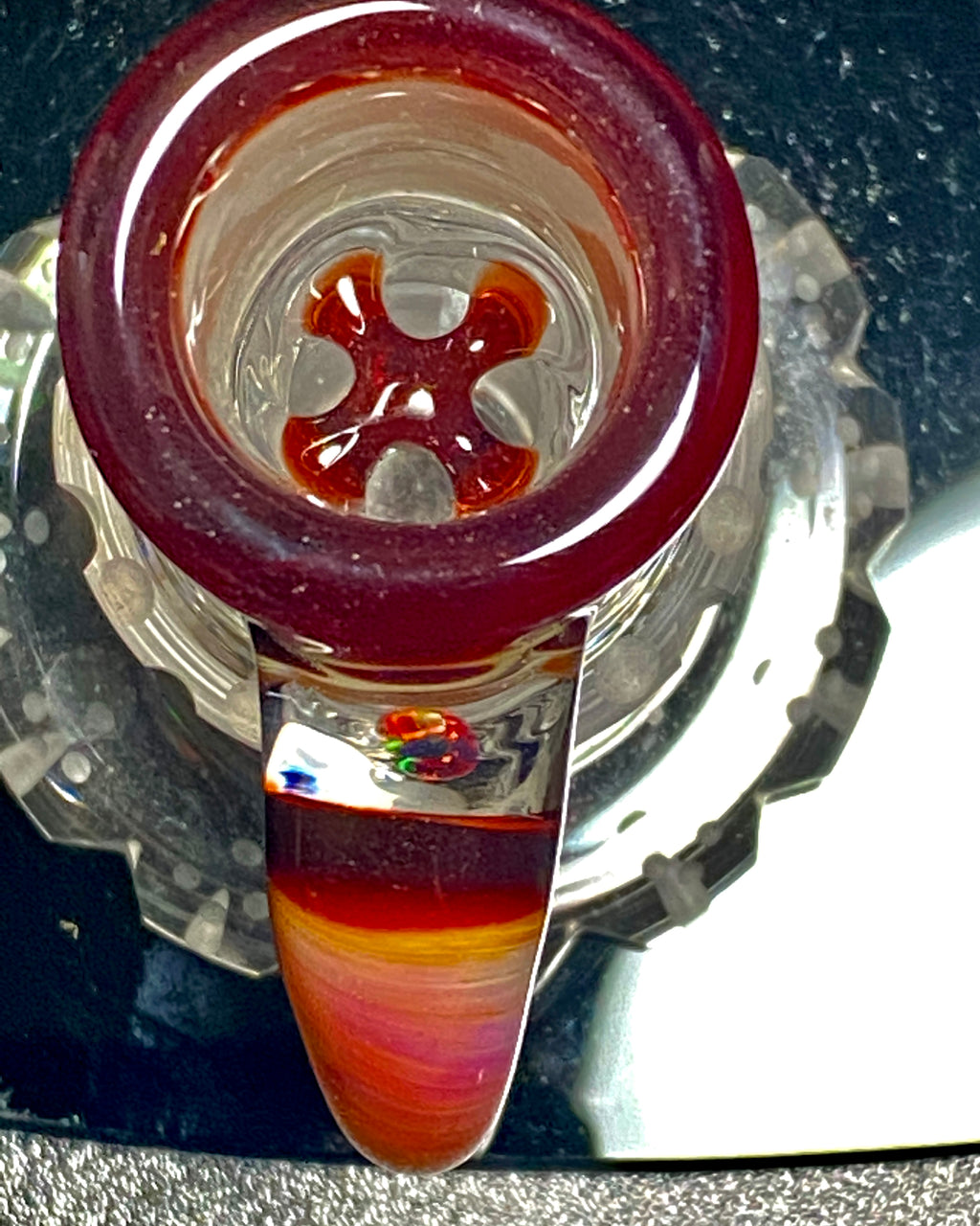 Mary Blows Glass Worked Red/Yellow Horn Handle w/ Opal 18mm Slide.
