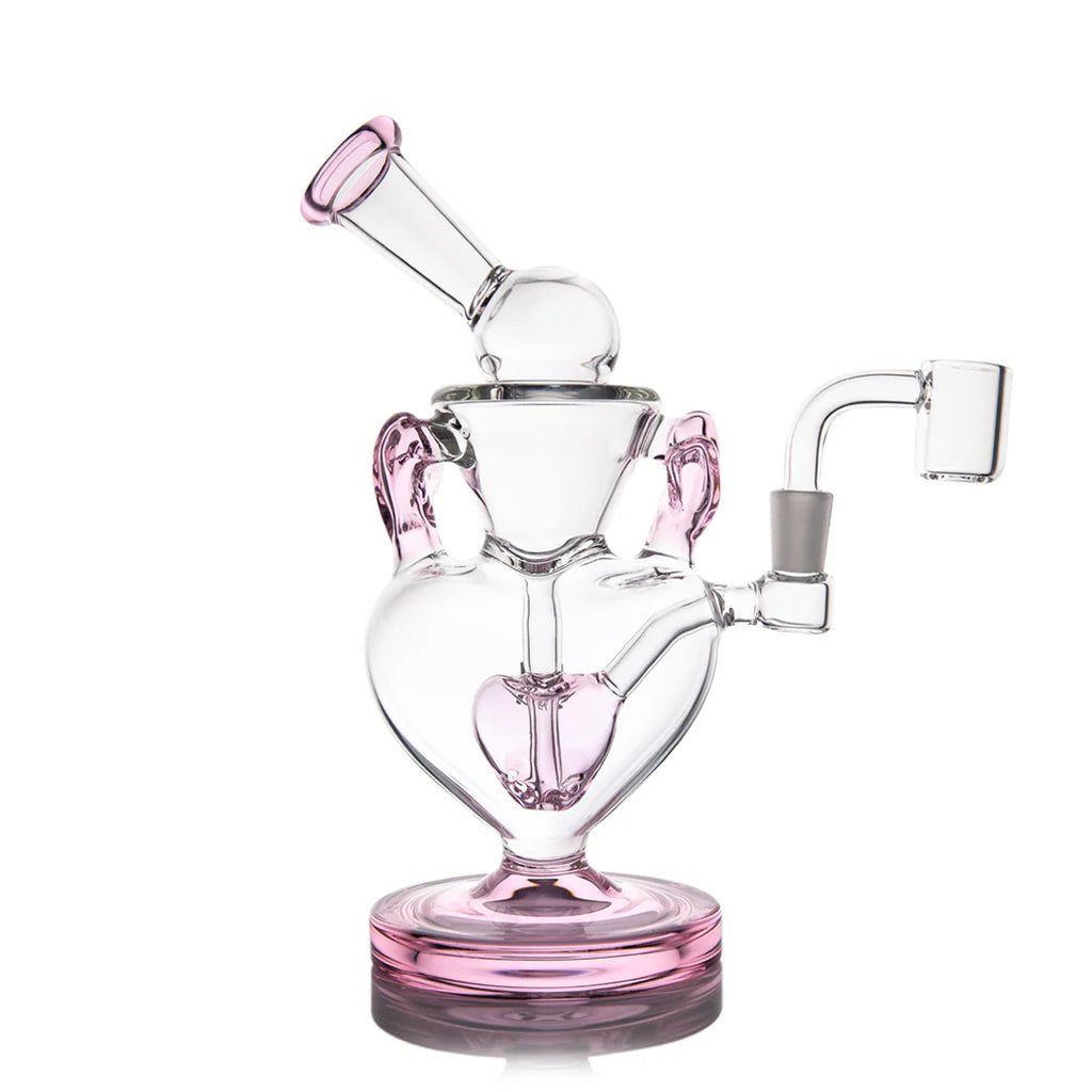 The Melting Hearts Mini Rig is here to set your Valentine’s Day ablaze with love and terps. As part of MJ Arsenal’s 8th Annual Valentine’s Day Collection, this romantic piece is designed to impress with its delicate pink hue, heart-shaped chamber, stunning heart features on each arm, splash guard, and perc. Handcrafted from premium borosilicate glass and designed with a double uptake recycler function, it’s built to provide smooth, flavor-packed hits with every use while doubling as a conversation-starting centerpiece.