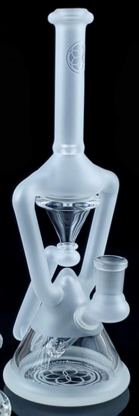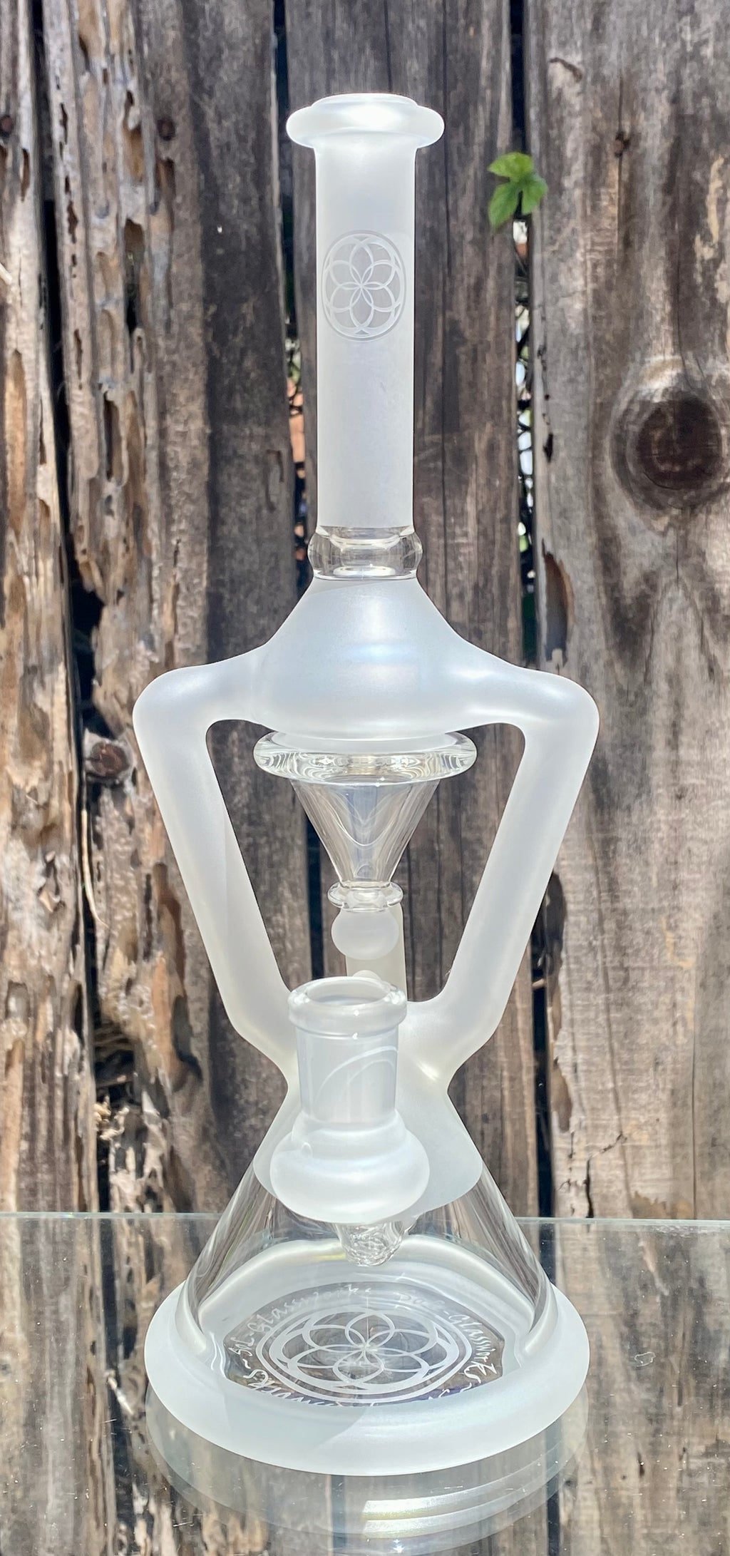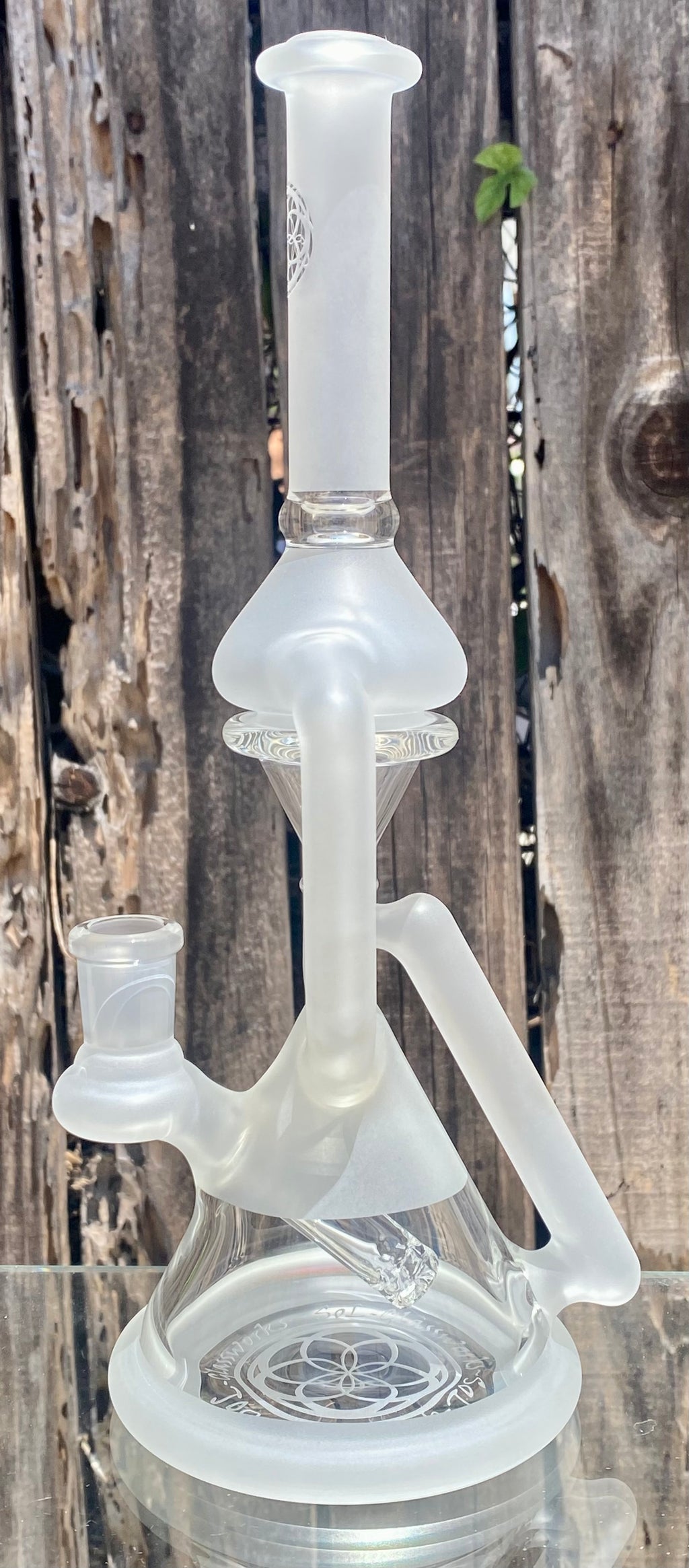 The SoL Nebula recycler is a Double Uptake, single drain recycler, it stands at 9.5″ tall, has a 14mm joint, a thick weighted foot with the SoL Circle logo on the bottom and a beautifully crafted Lace-Perc for smooth function!