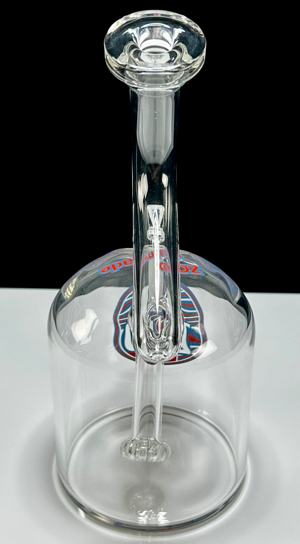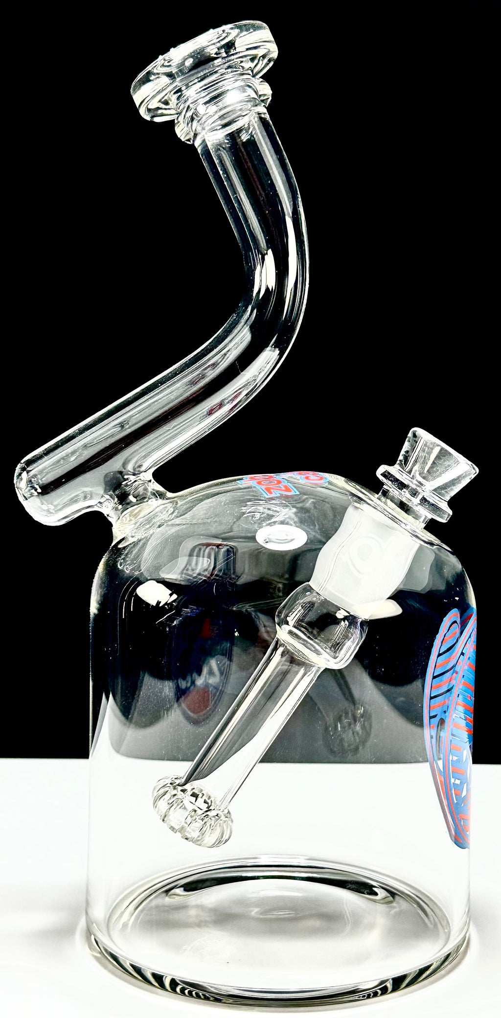 This bubbler from Zob Glass is one of the new designs they're rolling out.  It's approx. 10.5 inches tall and is made of 5mm thick glass.  The chamber on this bubbler is 110mm in diameter.  This is a big chamber, for big rips!  The bent design of the neck ensures a comfortable session that's splash free.  The pipe has a fixed flat disc diffuser for cool, clean rips every session.  This bubbler comes with an 18mm ground glass slide.