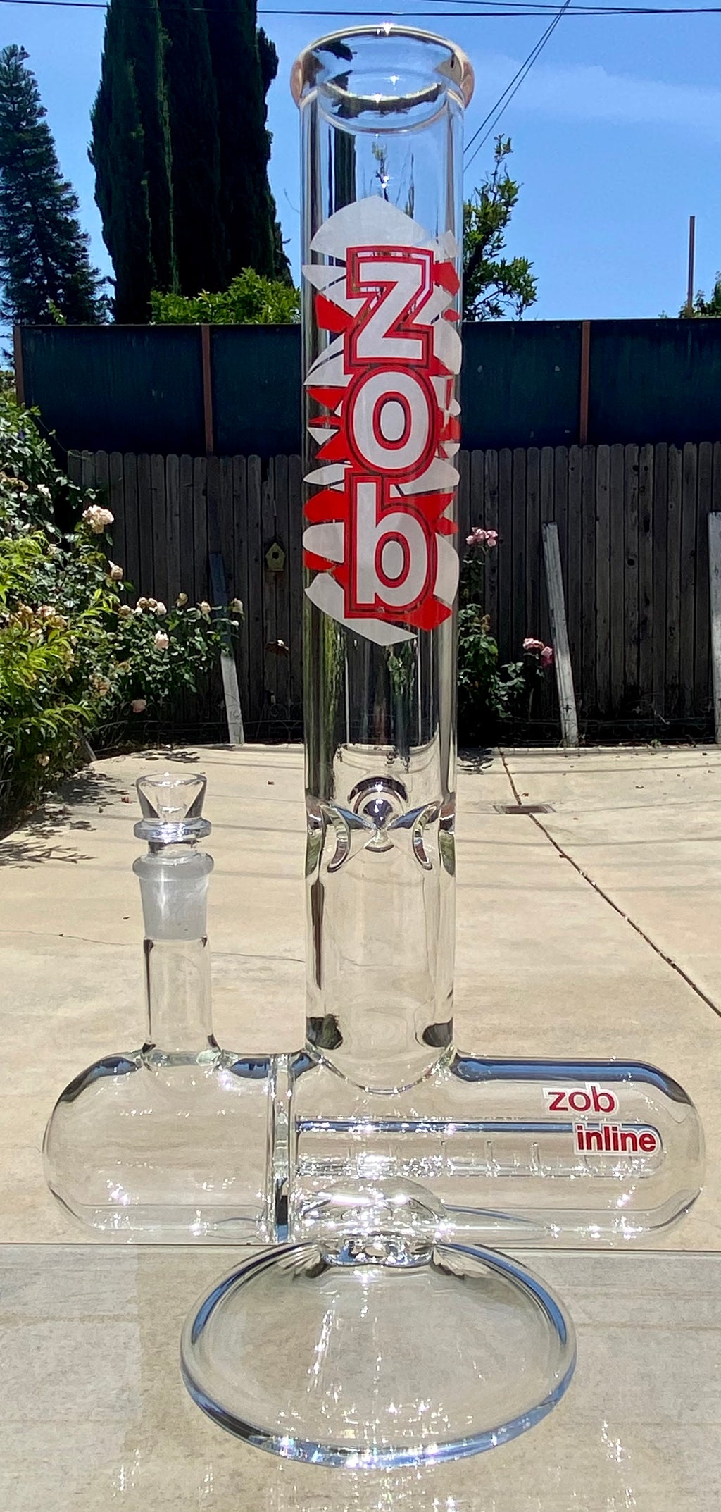 Zob Inline Diffused Straight Tube Zob Glass make this badass inline diffused straight tube. It's approx. 14 inches tall, and features an inline diffuser. The pipe has a three-prong ice pinch, so you can pack the tube full of ice for extra chilled rips. It's made of 5mm. thick American made glass and sits on a sturdy 5-inch glass base. This is a great piece to pass around with friends! Zob standard 18mm. ground glass slide comes with this beast.